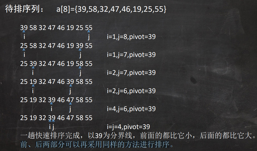 - 第五步:当i,j相遇,停止所有行动。此时左侧全部小于右侧(以对比元素为界限)
