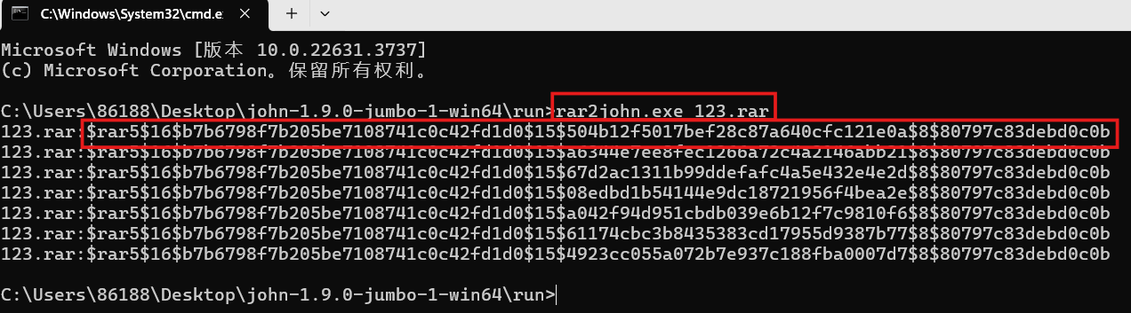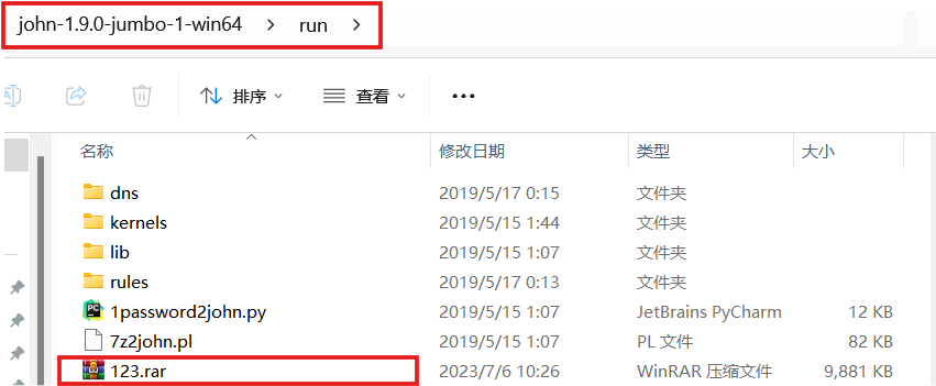 进入解压后 john文件内的二级目录 run中,并把需要破解的rar压缩文件存放在此处