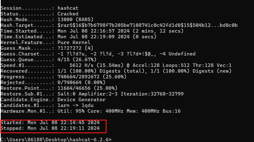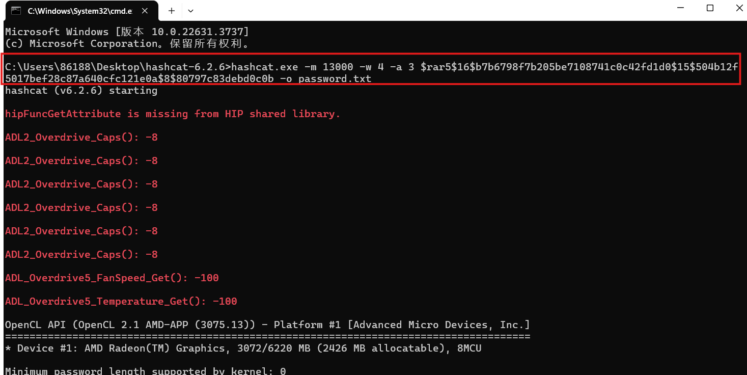 打开hashcat文件夹,同理打开cmd控制台后输入指令(HashValue替换为前步骤获得的值)